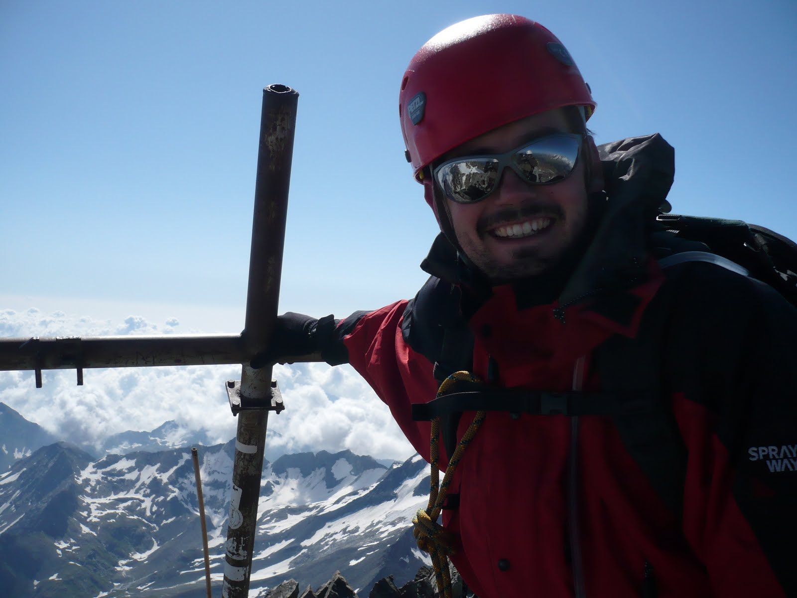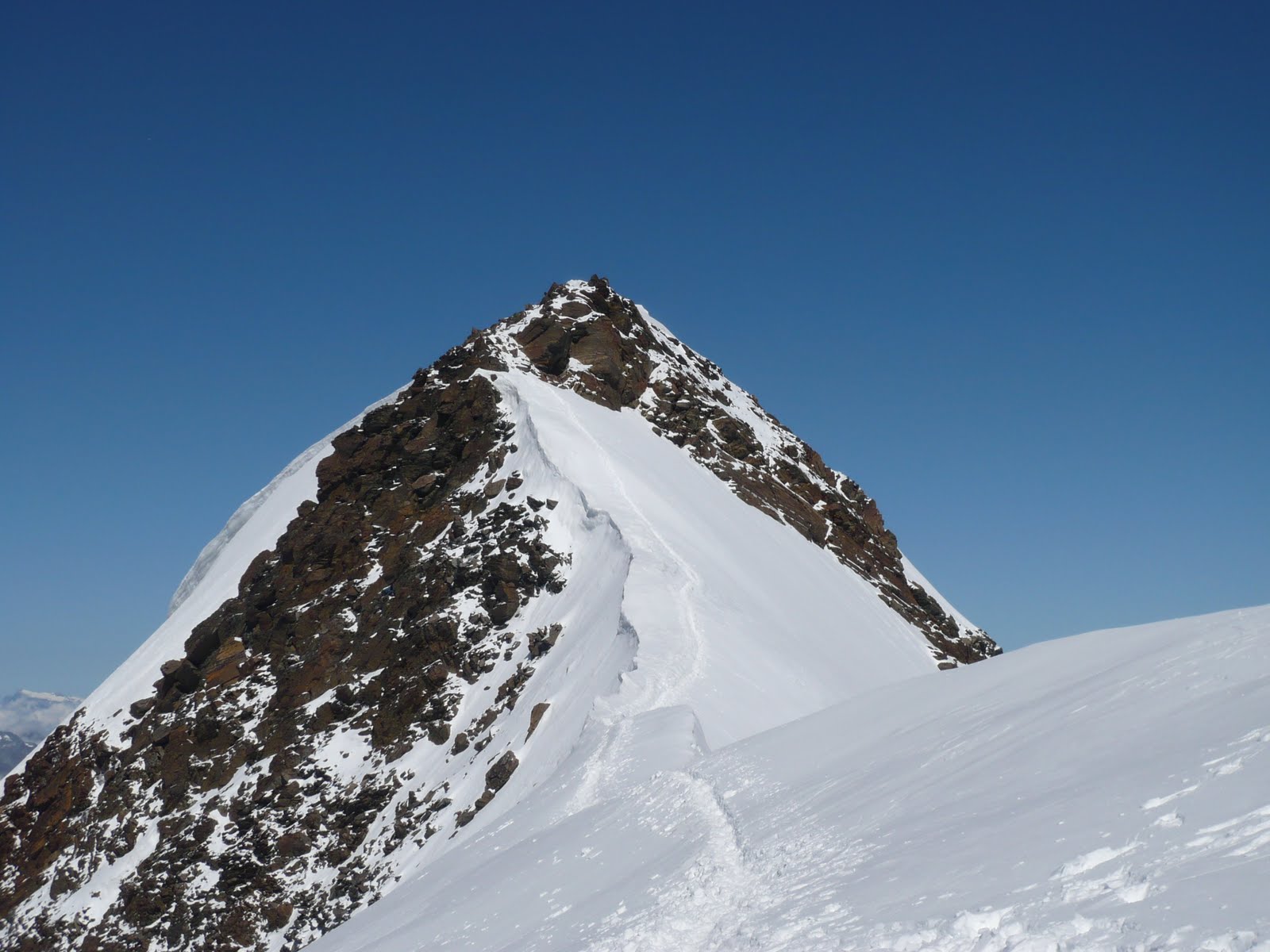 Haupthindernis war ein kurzes steiles Eisstück, das wir jedoch letztlich problemlos überwanden, so dass wir uns noch vor Mittag zu unserem zweiten Viertausender gratulieren konnten. Am überraschend engen Gipfel war es kalt und windig, so dass wir recht bald den Abstieg begannen.