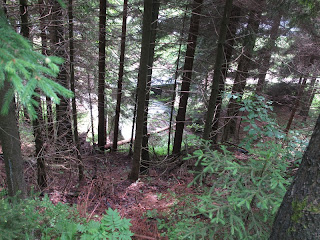auf den Gipfel des Fuchshübels (8138 dm), der allerdings nur aus einer Holzschlagschneise besteht. Von hier aus ging es steil hinab über einen Jägerpfad zu einer Straße. Am Eingang eines ehemaligen Bergbaustollens konnte ich den auf der Karte verzeichneten Weg nicht finden, also folgte kurze Waldkletterei
