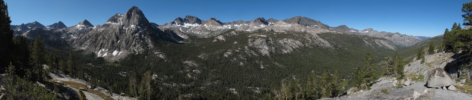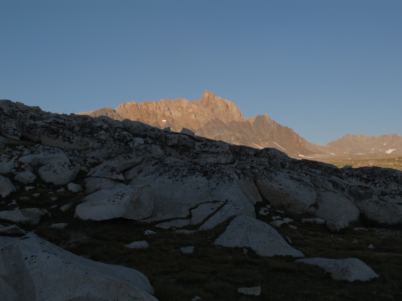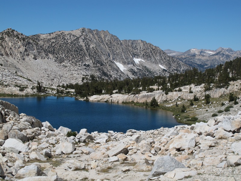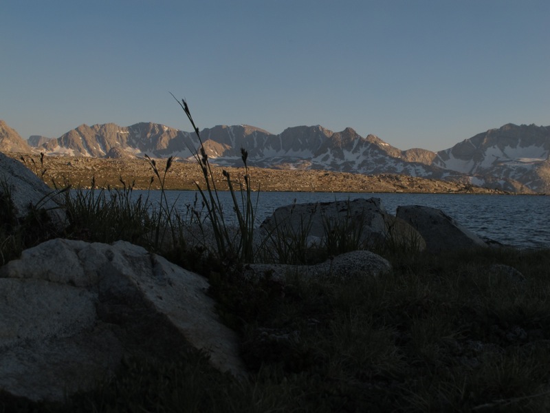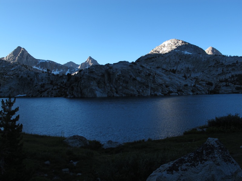 Östlich des Sees verläuft der Sierra Crest, also die Hauptwasserscheide des Gebirges zwischen Pazifik im Westen und dem endorheischen Great Basin im Osten; nördlich des Sees verläuft die Mono Divide. Den Kreuzungspunkt der beiden Kämme bildet der elegante Mount Abbot. Westlich davon thront Mount Gabb über dem Nordufer des Sees und zwischen den beiden Gipfel liegt Gabbot Pass, heute mein erstes Ziel.