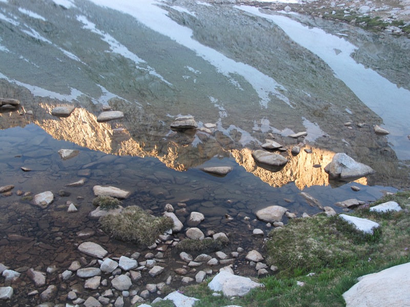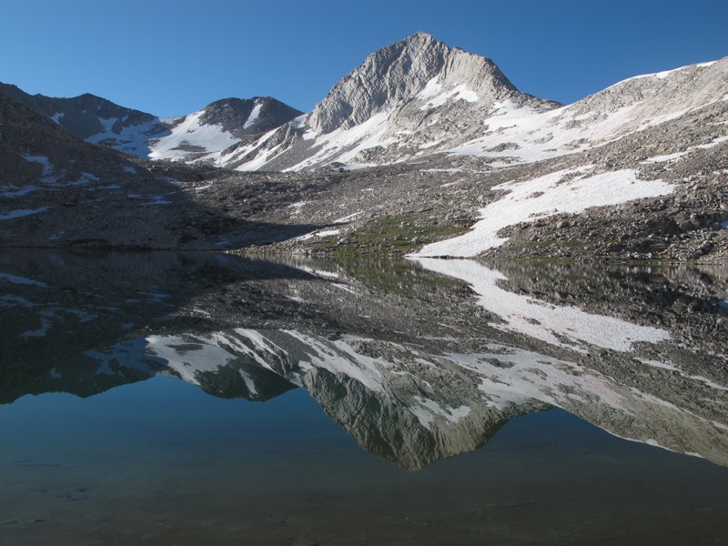 Der nordseitige Abstieg von Gabbot Pass war wieder einmal schneereich, aber unschwierig. Am späten Vormittag erreichte ich Lower Mills Creek Lake. An diesem Bergsee musste ich aufgrund akuter landschaftlicher Schönheit eine Pause einlegen, bevor ich den Abstieg ins Second Recess anging, eines von vier Hängetälern, die südwärts vom Tal des Mono Creek abzweigen.
