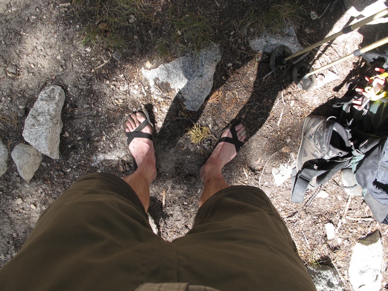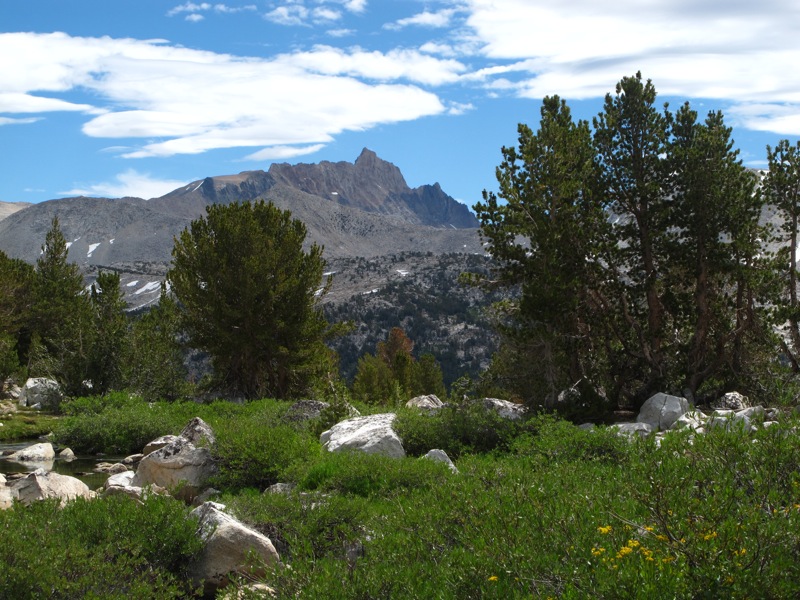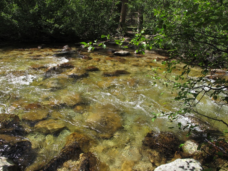 Im Tal angekommen überschritt ich Piute Creek und erreichte kurz darauf den in Ost-West-Richtung verlaufenden Piute Pass Trail. Etwas überraschend traf ich genau an der Stelle, an der ich den Trail überqueren wollte, einen anderen Wanderer. Es war ein Kanada lebender Schotte, mit dem ich kurz Neuigkeiten austauschte und der mich durch seinen Hinweis auf einen wackelnden Trittstein vor einem Bad im nächsten Bach bewahrte.