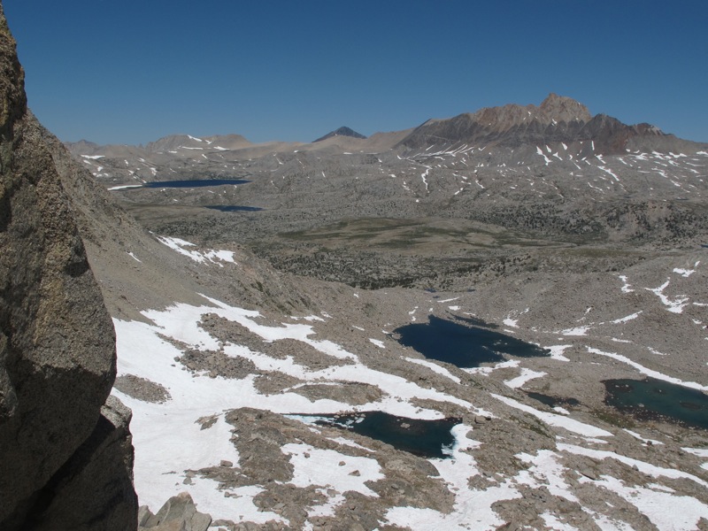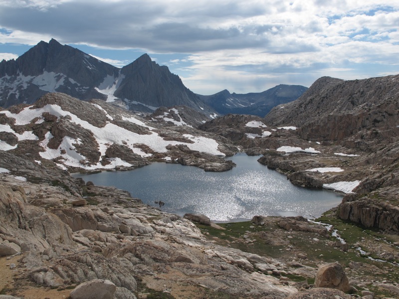 Am Merriam Lake wendet sich die High Route wieder in die allgemeine Vorzugsrichtung – nach Norden. An weiteren Seen vorbei erklomm ich Feather Pass (12350 ft, 3764m), wo ich viertel nach zwei ankam. Der Rückblick offenbarte kurze aber starke Niederschläge im Humphreys Basin, während ich glücklicherweise trocken blieb. Der Abstieg ins Bear Lake Basin hatte dann nicht viel mit den Beschreibungen in Ropers Buch zu tun, denn das Tal war bis zum ersten See des Beckens – Bear Paw Lake – fast vollkommen schneebedeckt (natürlich wieder mit Suncups, sonst wäre es ja zu einfach).