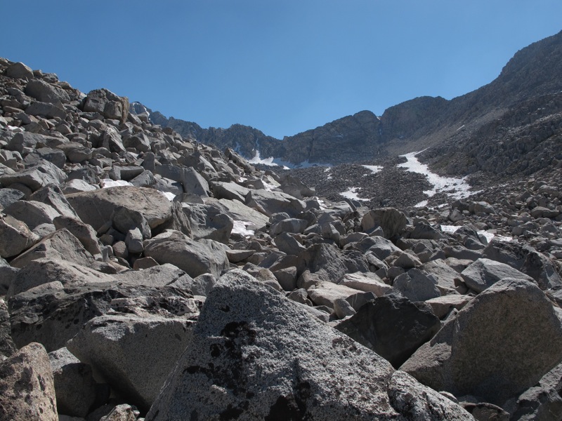 Der nordseitige Abstieg beginnt mit einer extrem brüchigen, steilen Passage, in der man bei jedem Schritt eine kleine Gerölllawine auslöst. Hat man diese mit der nötigen Vorsicht gemeistert, gelangt man an ein Schneefeld und kurz darauf beginnt das, was Roeper als „horrible, endless talus“ bezeichnet. Und das trifft es ziemlich gut: Chaotisch geformte Blöcke von Koffer- bis Autogröße sind hier übereinandergestapelt, jeder Schritt erfordert genaues Treten und entsprechend mühsam ist das Fortkommen. Immerhin sind die allermeisten Blöcke fest, nur ein, zwei Mal bewegte sich etwas, was sich nicht hätte bewegen sollen. An einigen Stellen waren die Blockhalden durch Schnee mit tiefen Suncups unterbrochen, auf dem man auch nicht richtig gehen konnte – es war wirklich kein Spaß.