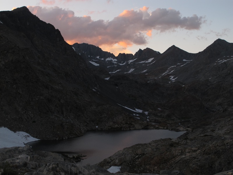 Nach Überwindung dieses aquatischen Hindernisses stieg ich zum südlichen Twin Island Lake auf, an dessen Südende ich einen gut geschützten Lagerplatz fand. Ich war gerade rechtzeitig mit dem Abendessen fertig, um von einem Granithügel aus den Sonnenuntergang und das Alpenglühen an der Ritter Range zu betrachten. Hier allein zu stehen und dieses wunderschöne Lichtspiel zu betrachten fühlte sich geradezu magisch an. Ein ganz besonderer Moment – und von einem tiefen Glücksgefühl erfüllt ging ich später zu Bett, betrachtete einmal mehr den herrlichen Sternenhimmel und ließ mich auch von gelegentlichen Blitzen im Osten nicht lange vom Einschlafen abhalten.