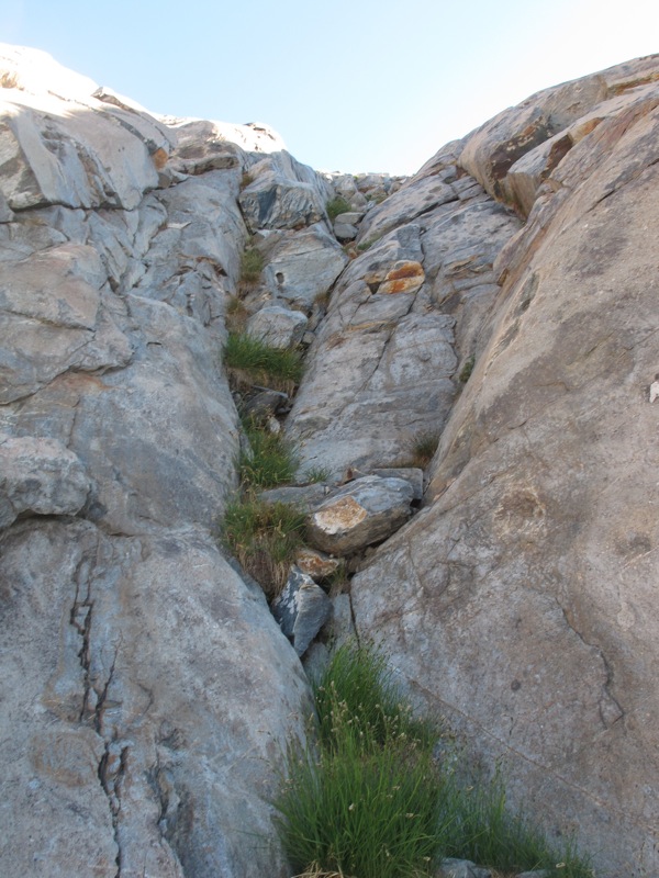 So stieg ich also zunächst zum Cecile Lake. Kurz unterhalb des Sees muss eine steile Felsstufe überwunden werden. Geradeaus führte ein kurzer Kamin hinauf, weiter rechts konnte man augenscheinlich etwas einfacher durch eine flache Verschneidung aufsteigen. Doch der Kamin sah so interessant aus, dass ich ihn einfach versuchen musste. Also schob ich meine Wanderstöcke zusammen, steckte sie hinter den Schultergurt meines Rucksacks und legte Hand an den Fels. Und es war eine Freude! Fester Fels, leichte Kletterei bis II, nur leider viel zu kurz.
