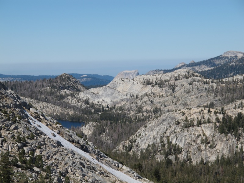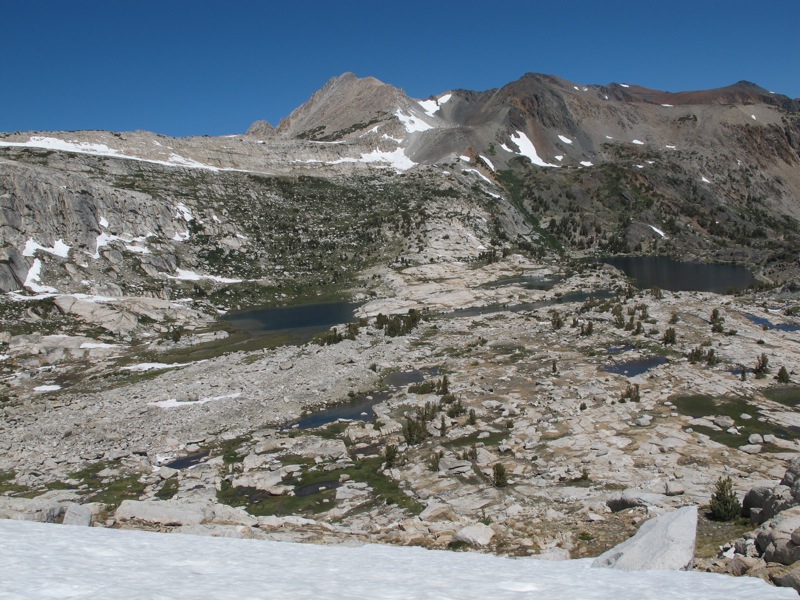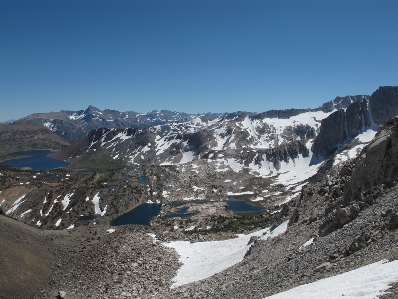 An diesem See beginnt der Aufstieg zum Sky Pilot Col. Der untere Teil war noch angenehm, dann folgten mäßig feste Blockhalden, steiler Schnee und schließlich ein Geröllhang, „that most hikers will find offensive“ (Roper). Für die Aufstiegmsühen entschädigt der 11650 ft (3551m) hohe Pass mit einer Aussicht, die sowohl die bereits bewältigte Wegstrecke umfasst und sich bis Mount Dana und Cathedral Range fortsetzt als auch den nördlichen Teil des Yosemite National Park zusammen mit Matterhon Peak, dem letzten großen Gipfel an der High Route, umfasst.