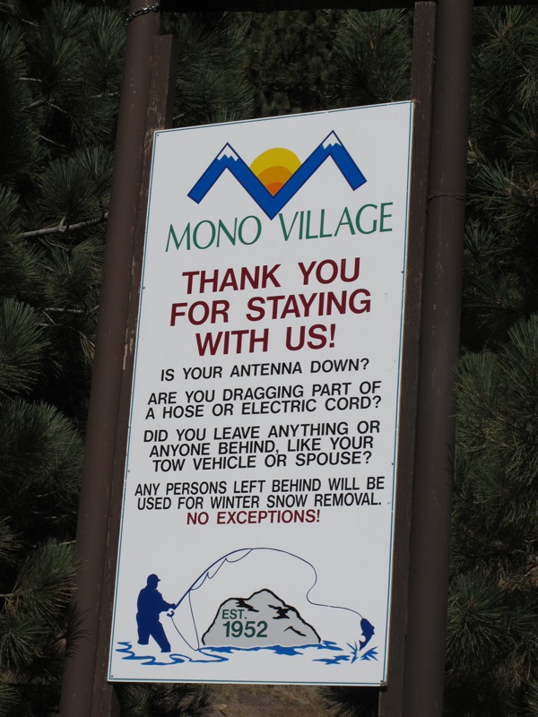 Ich gelangte zurück in die Zivilisation an einer Kette, die über den Weg gespannt war. Dahinter standen die größten Wohnmobile, die ich je gesehen hatte. Ein Mann saß entspannt vor seinem Vehikel und sah mir gelangweilt dabei zu, wie ich über den Campingplatz ging. Die Leute hier hatten auf jeden Fall eine andere Auffassung von „Camping“ als ich. Und dann kam ich zur Ausfahrt des Campingplatzes. Hier also, nach 17 Tagen, 195 Meilen und 16000 Höhenmetern, nach Grouse Lake Pass, Goat Crest Saddle, Grey Pass, White Pass, Red Pass, Frozen Lake Pass, Mather Pass, Cirque Pass, Potluck Pass, Knapsack Pass, Muir Pass, Snow Tongue Pass, Puppet Pass, Feather Pass, White Bear Pass, Gabbot Pass, Bighorn Pass, Shout-of-Relief Pass, Duck Pass, Mammoth Pass, Nancy Pass, Whitebark Pass, Glacier Lake Pass, Blue Lake Pass, Vogelsang Pass, Tuolumne Pass, Mine Shaft Pass, Sky Pilot Col, Stanton Pass und Horse Creek Pass, hier ging es zu Ende. Die ereignislose Nachmittagsruhe um mich herum stand in seltsamem Kontrast zur Freude und Genugtuung in meinem Inneren. Ich ballte nur kurz die Fäuste, dann nahm ich den Rucksack ab und begann mich nach einer Mitfahrgelegenheit nach Bridgeport umzusehen. Das unspektakuläre Ende einer großen Tour