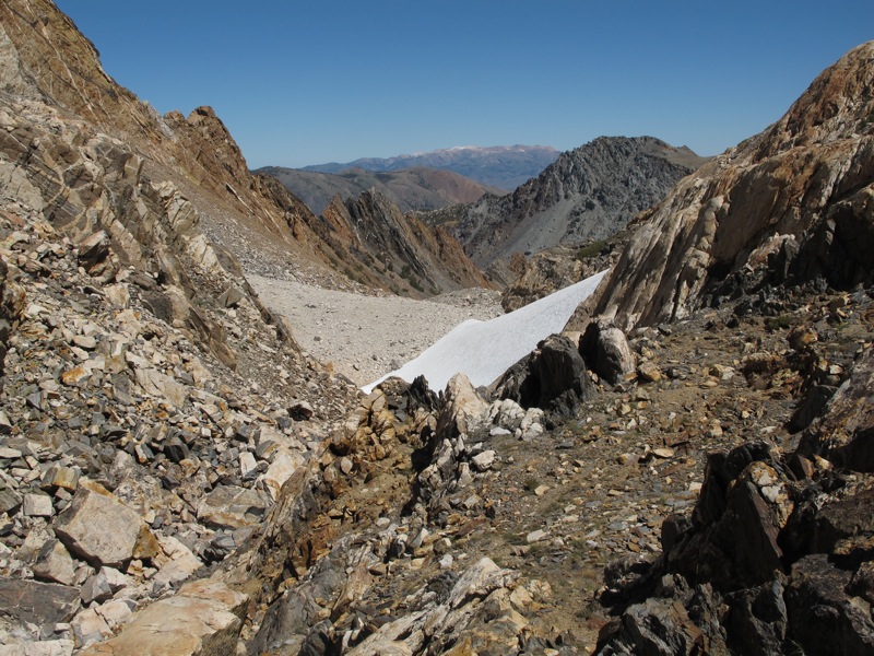 Am Pass angekommen, blickte ich ein letztes Mal auf die grüne und graue High Sierra, dann wandte ich mich nach Norden, einem Abstieg aus gelbem und rotem metamorphen Gestein entgegen. Dieser Abstieg bestand natürlich mal wieder aus Blockhalden, und zwar welchen der allerunangenehmsten Sorte, schlecht begehbar und lose. Ich vermute, sie wurden absichtlich so angelegt, um beim High Route-Wanderer keine Wehmut aufkommen zu lassen. 3500 ft muss man hier absteigen und die ersten 2000 davon waren ziemlich furchtbar.