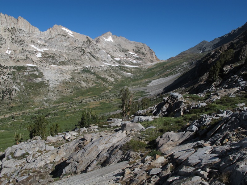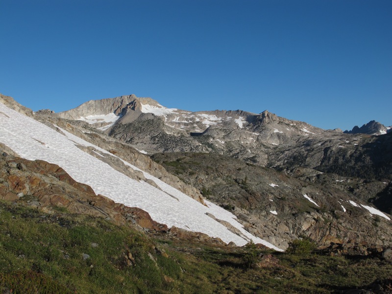Aber natürlich setzte ich meinen Weg trotzdem fort. Auch heute führte mich dieser durch herrliche supalpine Landschaften, Mount Conness immer im Blick. Steil ging es einen Grashang hinauf, der schließlich in Felsen überging und am Ostgrat des Berges endete. Hier empfingen mich fester Granit, Trittschnee und ein großartige Aussicht. Die Kraxelei ein kurzes Stück den Grat hinauf und dann auf der Nordseite hinab in Richtung der Conness Lakes stellte meine gute Laune augenblicklich wieder her. Noch hoch oben – es war kurz nach elf – machte ich eine Pause und genoss die weite Sicht. Anschließend setzte ich meinen Abstieg fort und wanderte weiter zum Cascade Lake.