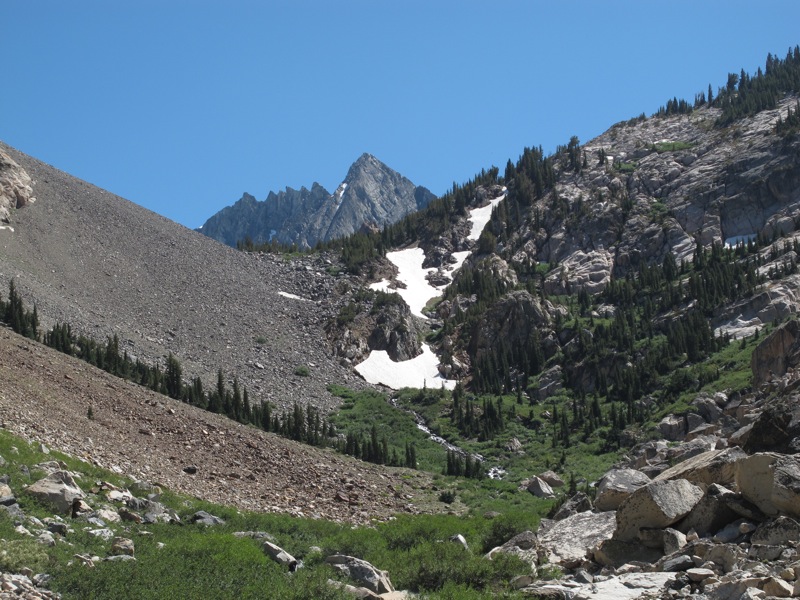 Als ich mich an den Abstieg machte, merkte ich bald, dass die Aussicht auch dafür entschädigen muss. Oben begann es mit einem steilen Geröllhang, dann folgten – Überraschung! – mäßig feste Blockhalden und Schnee mit Suncups. Dazu tat mir die Vorderseite des linken Sprunkgelenks weh – die Strafe für zu viel Abstiegsturbo am Vortag. Als ich um 15:00 Uhr Shepherd Lake erreichte, war ich mental ganz schön erschöpft. Allerdings schien es mir noch zu früh zu sein, um hier nächtigen. Also stieg ich nach einer Pause gemütlich durch gras- und blumendurchsetzten Nadelwald in den Virginia Canyon ab, überquerte Return Creek und stieg auf der Westseite wieder auf.