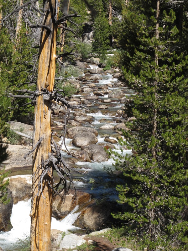 Dank Turbo kam ich bereits gegen halb zwei am Abzweig in Richtung Granite Lakes (und Mine) an. Damit stand fest, ich gehe weiter. Duch Nadelwald ging es sanft auf und ab, immer an der Dana Fork des Tuolumne River entlang. Nach etwa 2 Meilen bog der Trail dann nach links und führte in den Fluss. Das Wasser war hier nur etwas mehr als knöcheltief und problemlos zu durchqueren. Auf der anderen Seite setzte ich mich auf einen Stein, hielt die nassen Füße in die Sonne und genoss Wetter und Umgebung.