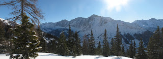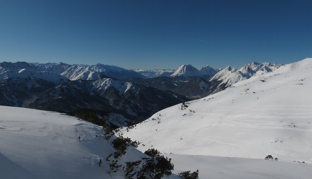 Wir starteten ca. 20 nach acht bei bitterer Kälte in Scharnitz. Als Ziel standen die als Skigipfel recht beliebte Pleisenspitze und die seltener begangene und anspruchsvollere Larchetkarspitze zur Auswahl; eine Entscheidung, welcher Gipfel es werden würde, wollten wir an der Pleisenhütte treffen.