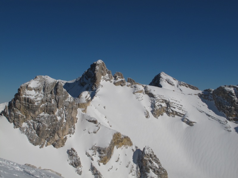 Von hier aus konnten wir auch den östlichen Nachbarn Larchetkarspitze betrachten; die letzten 100 Hm muss man dort auf einem Klettersteig bewältigen und gespurt war auch nichts – für diesen Tag wäre diese Tour wohl etwas zu lang geworden, aber vielleicht ein anderes Mal.