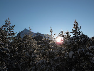 Zunächst hieß es für eine knappe halbe Stunde, die Ski zu tragen, dann zweigte ein Forstweg von der Straße ab und wir konnten endlich mit Ski an den Füßen weiter gehen. Bald darauf trafen uns die ersten Sonnenstrahlen und milderten die Kälte etwas ab.