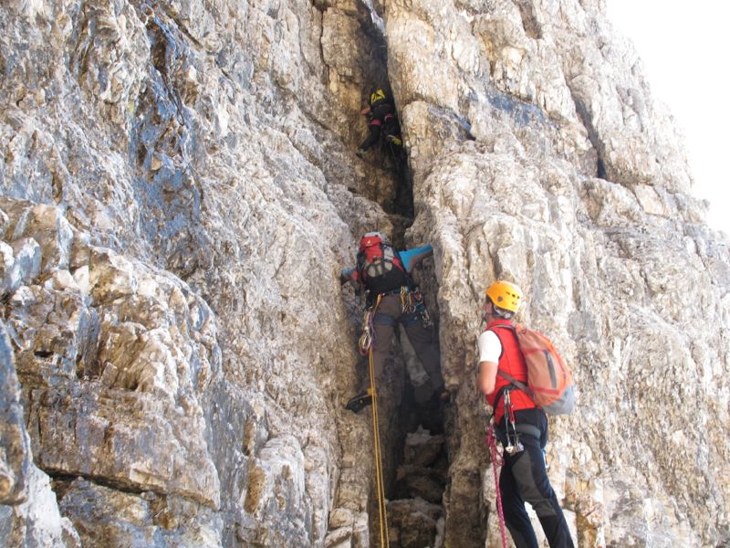 Der Normalweg an der Großen Zinne ist recht komplex und führt durch Rinnen und kurze Wandabschnitte meist im II. und gelegentlich im III. Schwierigkeitsgrad bis zu einem großen, bereits von unten gut sichtbaren Kamin im rechten Teil der Südwand. Dieser wird nicht direkt erstiegen, stattdessen befindet sich rechts davon ein weiterer, kleinerer Kamin, nass, von vielen Begehungen glatt poliert und die Schlüsselstelle der Tour (III, manchmal auch als IV- angegeben). Zunächst testete ich, ob auch diese Stelle seilfrei begehbar sein würde; der untere Teil war okay, der obere mir dann doch zu heikel. Nach etwas mühsamem Abstieg bauten wir also am unteren Ende des Kamins einen Stand und Boris stieg das Ding vor. Durch dieses Manöver hatten wir einiges an Zeit verloren und so holten uns einige andere Seilschaften ein, stiegen teilweise sogar an uns vorbei. In einem Bergführer erkannte ich Valentin von der Alpinschule Pustertal, der 2011 eine Skitour für uns geführt hatte.