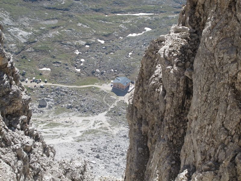 Nach wohlverdienter Gipfelrast machten wir uns gegen halb vier an den Abstieg. Das Abseilen bis zum Ringband war etwas mühsam und ging – auch da wir zu dritt waren – recht langsam. Am Ringband stieß noch eine weitere Seilschaft zu uns, die die Dibona-Kante geklettert war, so dass wir ab hier zu fünft mit zwei Doppelseilen abseilten. Der erste Abseilstand, der uns durch den großen Kamin hinab führte, bestand aus zwei durch eine Kette verbundenen Borhaken; die folgenden Stände waren leider etwas zweifelhafter, was nicht gerade zu dynamischer Talfahrt animierte. Und so dauert es eine gefühlte Ewigkeit, bis wir wieder in der Einstiegsschlucht standen. Die letzte Abseilfahrt dort hinunter war erstaunlich steil und ich wunderte mich etwas, dass wir hier problemlos seilfrei aufgestiegen waren. Endlich unten gab es noch Probleme mit dem Abziehen des Seils, dann stiegen wir über die Rampe hinunter und zwanzig nach neun trafen Boris und ich wieder am Rifugio Lavaredo ein – todmüde aber glücklich.