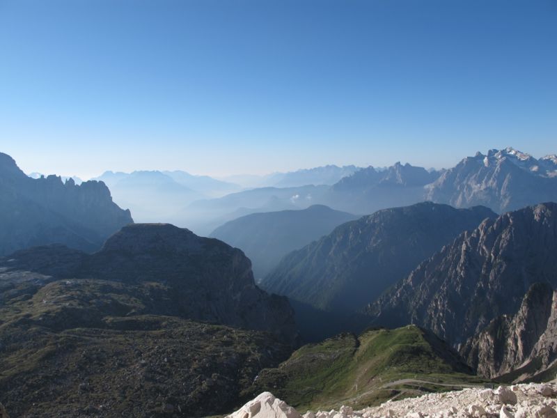 Oben erwartete uns eine herrliche Aussicht über die Dolomiten mit den Drei Zinnen prominent im Vordergrund. Da waren wir gestern oben? Wahnsinn!
