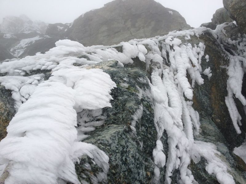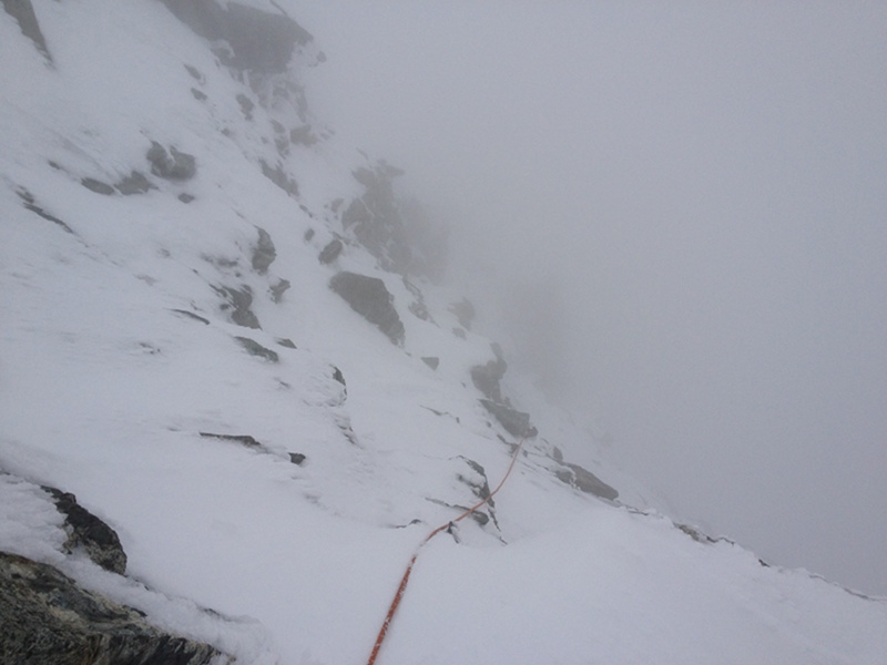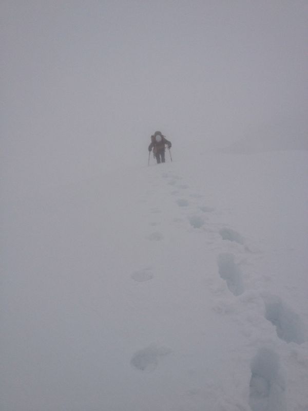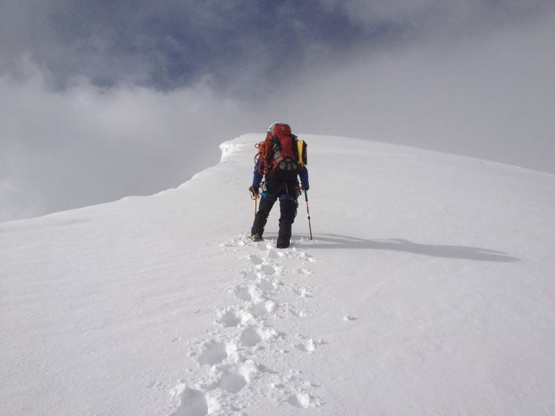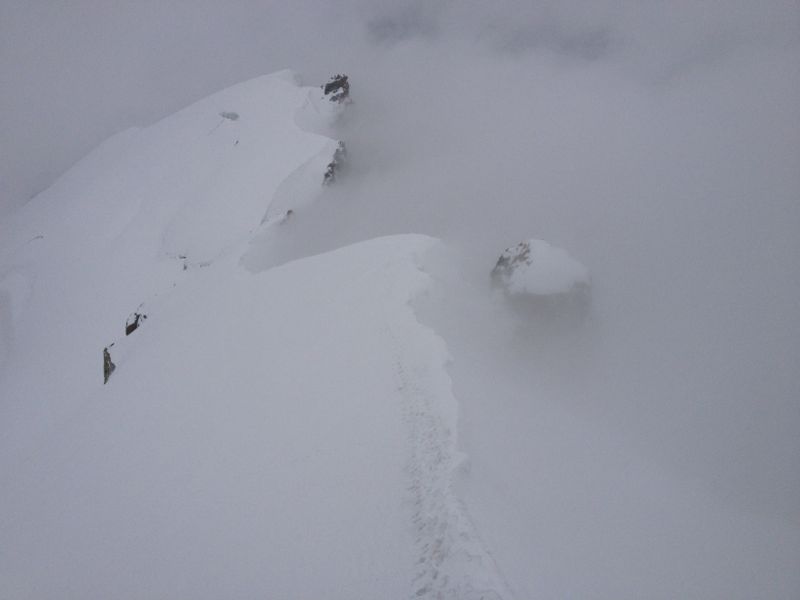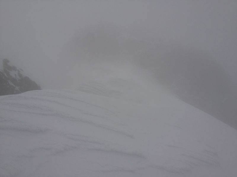Doch der Sonnenschein war nur von kurzer Dauer. Mittlerweile konnten wir überhaupt keine Spur mehr erkennen und im zunehmenden Nebel orientierten wir uns vor allem an der Gratkante, während wir erneut mühsam durch knietiefen Schnee spurten. An der Schulter auf ca. 3800 m flachte es kurz ab, dann verlangte ein Steilaufschwung aus Blankeis, Triebschnee und verschneiten Felsen ein wenig Steigeisen- und Pickeleinsatz. Anschließend wieder Spuren durch knietiefen Schnee. Hört das denn nie auf?