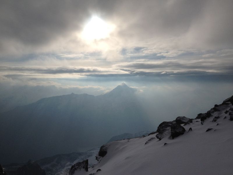 Auf ca. 3600 m geschah dann, was wir kaum zu hoffen gewagt hatten: Die beharrlich auf ca. 3800 m hängende Wolkenschicht riss auf und die Sonne kam heraus. Sofort schien alles viel freundlicher; unsere Schatten zeichneten sich scharf auf dem glitzernden Schnee ab, die Aussicht auf die umliegenden Berge verwandelte sich von trüb in dramatisch. Da störte selbst die Absurdität nicht mehr, dass Skifahrer gegenüber ihr Unwesen trieben, und voller Optimismus stiegen wir weiter.