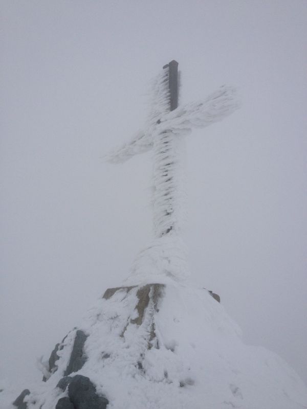 Sämtliche Schlingen, die ich am Gurt trug, hatten mittlerweile einen kleinen Eispelz angesetzt, die Standschlinge zierte sogar ein beachtlicher Zapfen. Na ja, wenigstens schneite es nicht. Als dann endlich, endlich, kurz vor 15:00 Uhr das Gipfelkreuz aus dem Nebel auftauchte, war die Erleichterung schon gewaltig. Geschafft – der Rest würde einfach sein.