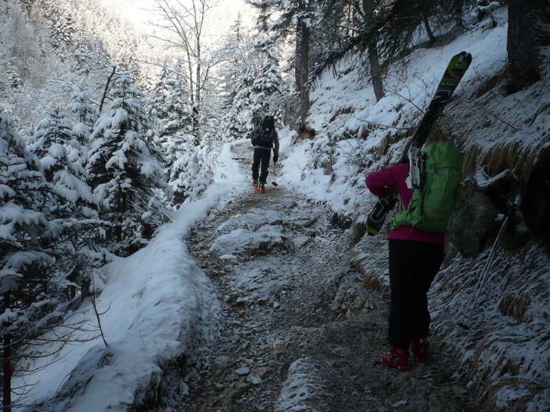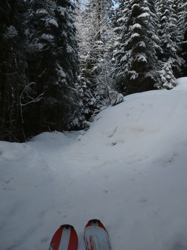 Am Ende des Forstweges passierten wir die Grenze zurück nach Bayern und stiegen auf die Ski, um den schmalen Schützensteig hinauf zu steigen. Es begann gut, doch schon kurz darauf reichte die Schneeauflage nicht mehr zum Gehen und es folgte eine längere Tragepassage, bis der Steig ins Tal des Schafblassenbaches abbiegt.