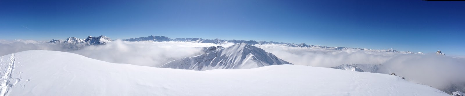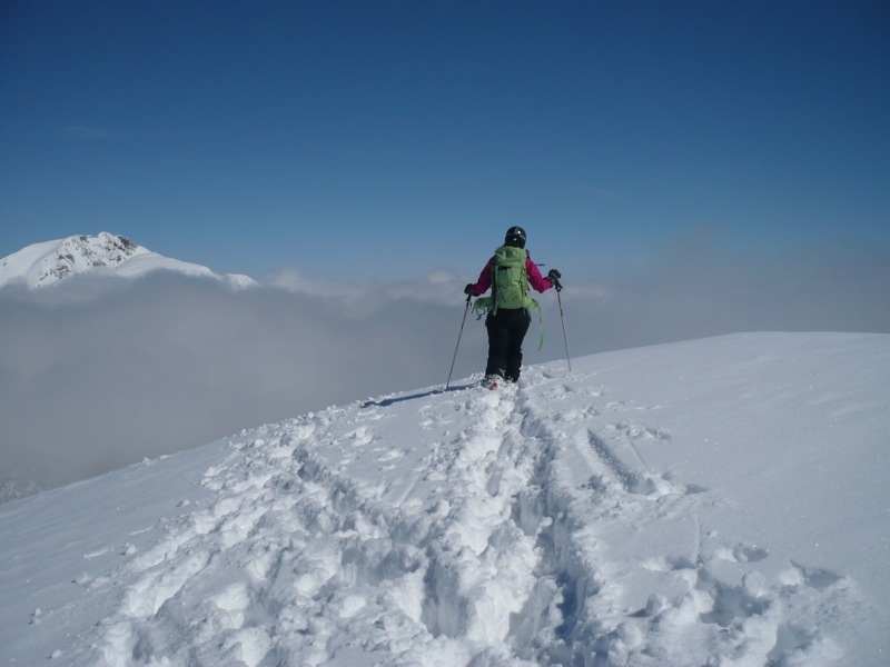 Nach einer Rast auf der Almfläche (1525 m) erklommen wir den Ostrücken unseres Gipfels und folgten diesem west- und aufwärts. Hier durften wir auch selbst spuren, da meist nur noch einige Schneeschuhspuren vorhanden waren, die für Ski nicht wirklich passten. In zahlreichen Spitzkehren ging es dabei den stellenweise steilen Rücken empor. Kurz vor dem Gipfel riss es dann wieder auf und wir waren nun über den Wolken. Herrlich!