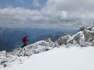 Zunächst ging es auf einem Pfad und über leichtes Blockwerk bergan, ab ca. 2400m lag dann fast durchgehend Schnee. Wir waren eine recht sture Seilschaft – jeder von uns wollte unbedingt spuren und jeder durfte auch mal. Der Neuschnee war dabei meist knöcheltief, nur hin und wieder brach man auch tiefer ein.