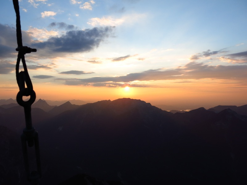 Noch einmal Pause und genießen. Was für ein Geschenk, von hier aus den Sonnenuntergang über der Hochplatte bewundern zu dürfen und diesen Aussichtsbalkon dabei ganz für mich zu haben! Außer mir weit und breit niemand unterwegs. Am liebsten wäre ich gar nicht wieder abgestigen aber gegen neun riss ich mich dann doch los, um den oberen Teil des Abstiegs noch bei Tageslicht absolvieren zu können.