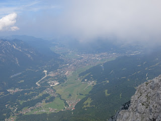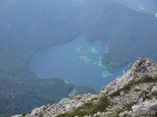Auf ca. 1950m trifft man auf den Schafsteig, folgt diesem ein wenig nach Westen und erreicht so die Waxensteinrinne. Diese bietet originelle Kletterei (bis II) in wassergeglättetem Kalkstein; im oberen Bereich verlässt man Markierungen folgend die Rinne nach rechts und steigt über Schrofen in Richtung Gipfel. Viertel vor vier erreichte ich den höchsten Punkt auf 2277m und konnte die beeindruckenden Tiefblicke zum Eibsee und auf Garmisch genießen. Die Zugspitze war leider in Wolken verborgen, doch auch das Ammergebirge bot einen schönen Anblick. Da mein Magen ziemlich knurrte, hielt ich mich nicht allzu lang mit Schauen auf und packte bald mein Essen aus.