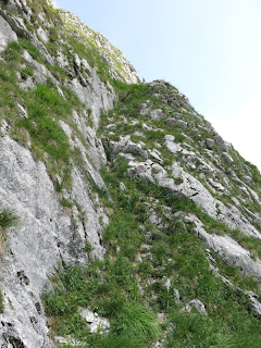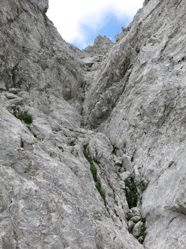 An einem roten „W“ auf der Nordseite des Tals beginnt ein herrlich wilder Steig durch Gras, Schrofen und Felsgelände (bis I), der zwar durchgängig markiert ist aber offensichtlich nicht allzu oft begangen wird. Die insgesamt 7 Leute, die mir von hier bis zum Gipfel begegnet sind (darunter eine Gruppe) war sicherlich schon dem Feiertag geschuldet.