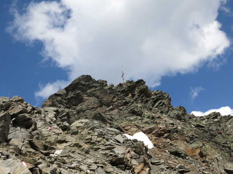 Etwas weiter oben stieg ich zunächst weglos über deren Westgrat zur Riegespitze, bis mir Zweifel an meinem Tun kamen. Der weitere Anstieg sah nicht einfach aus und der Verbindungsgrat zur Kreuzjöchlspitze noch schwieriger. Als ich dann unter mir an einem kleinen See eine Markierung sah, beschloss ich, diesen Gipfel auszulassen und direkt zur Kreuzjöchlspitze weiterzugehen.
