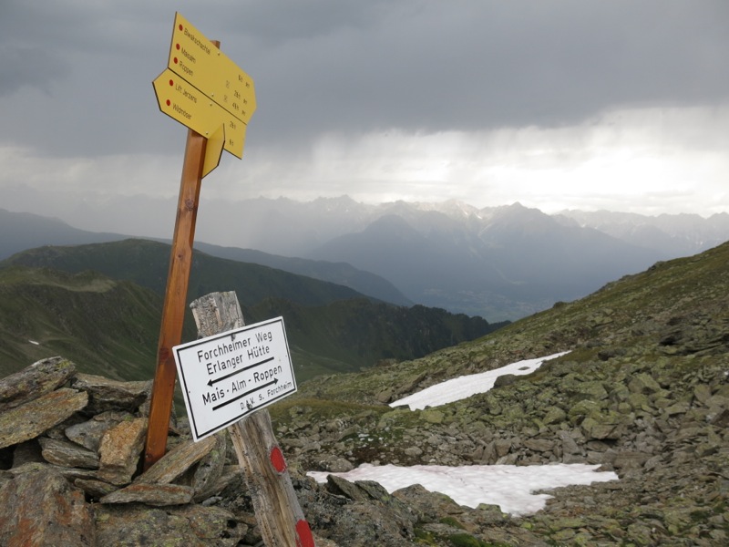 Eine halbe Stunde später erreichte ich nach einigem Auf und Ab den Murmentenkarsattel, während es im Inntal bereits donnerte. Mist, verschätzt! Schnell vom Sattel ins dahinter liegende Tal, Regenmontur anziehen und so zügig wie möglich weiter. Doch dieses Wettrennen konnte ich nur verlieren und gegen 14:00 Uhr hieß es Stöcke weglegen, hinsetzen, Kopf runter und abwarten, während es über mir blitzte und donnerte. Unheimlich war das schon, aber mehr konnte ich nicht tun.