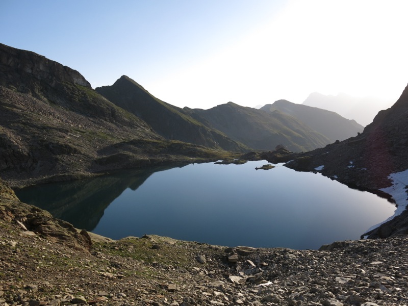 Nach einer halben Stunde war der Spuk dann vorbei und ich konnte den Aufstieg zum letzten Sattel vor der Hütte fortsetzen. Oben waren dann die Wolken schon wieder abgezogen und die Sonne strahlte vom blauen Himmel. Als ich kurz vor vier die Erlanger Hütte auf 2550m erreichte, war die Kleidung schon fast wieder trocken und entspannt konnte ich nach über 2000 Hm Eingangsetappe bei einem Bier mit den anderen Gästen Gewittergeschichten austauschen. Abends malten die abziehenden Wolken einen wunderschönen Himmel über die Stubaier Alpen, bevor schließlich das Licht verging und auch ich mich in das „Dunkelkammer“ genannte Einzellager zurückzog.