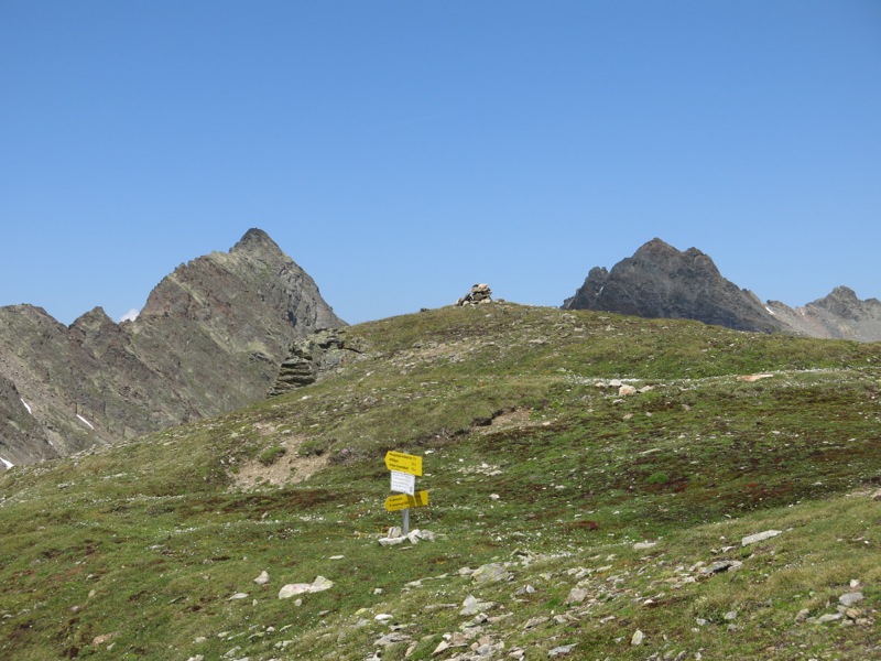 Nach einer kurzen Pause wählte ich den Abstieg nach Westen (Stelle I an einem kurzen Wandl), bog auf einen markierten Steig nach Süden ab und kam schließlich zum Abzweig Richtung Riegespitze und Kreuzjöchlspitze. Es folgte einer der steilsten Erdaufstiege, die ich bisher auf einem markierten Steig erlebt habe. Zum Glück ist diese kraftraubende Passage nicht allzu lang.