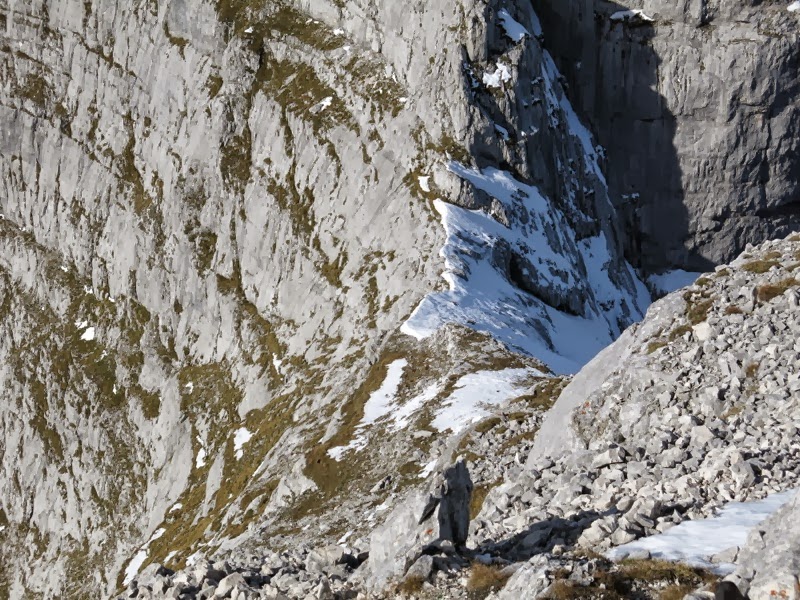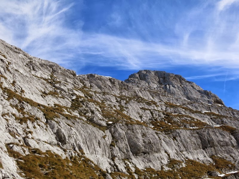 Während vor mir eine Seilschaft in den Grat einstieg, umging ich dessen Fuß auf einem Band mit etwas abdrängender Felsbegrenzung und wandte mich anschließend nach Nordwesten, in den Kessel hinein. Zunächst stieg ich über einige Bänder auf, folgte dann einer hinaufleitenden Band- und Rissspur und umging einen steilen Plattenaufschwund linkerhand (II). Hier nun eröffnete sich zu meinem Erstaunen (und im Gegensatz zu der Tourenbeschreibung, der ich allerdings auch schon weiter unten nicht gefolgt war) die Möglichkeit, nach einem kurzen Aufschwung (I) über grasige Schrofen direkt unter den Westgrat des Guffert zu gelangen. Noch kurz Hand anlegen (I-II) und ich stand auf dem Grat.