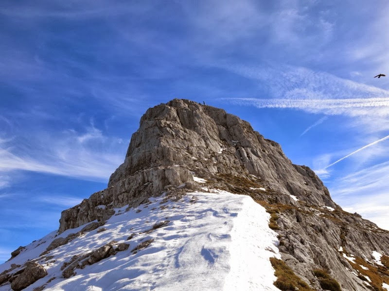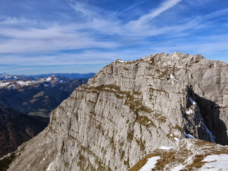 Auf der Nordseite des Grates lag noch hart gefrorener Schnee, so dass die ersten Meter etwas Balance erforderten, bevor sich der Grat verbreitert. Nun hatte ich noch zwei Steilstufen zu bewältigen (II), bevor ich kurz nach 12:00 Uhr den Gipfel des Guffert (2195m) erreichte. Das war schneller und einfacher gegangen als ich erwartete hatte!