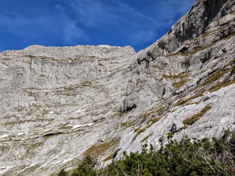 Unterhalb einer Felswand mit einigen großen Höhlen (ca. 1700m) zweigte ich vom Wanderweg nach links ab und folgte einer Latschengasse. Wahrscheinlich da hier auch der Zustieg zum beliebten Südgrat des Guffert verläuft, ist diese Gasse ziemlich komfortabel. Die Latschengasse endet an einem kleinen Kessel, von dem aus – hinter einer Stufe (I) – eine Felsrinne hinauf zum Fuß des Südgrates zieht. In der Rinne kann der ambitionierte Berggeher dann den festen, plattigen Fels dazu nutzen, sich für das Kommende schon mal warm zu machen.