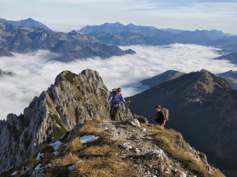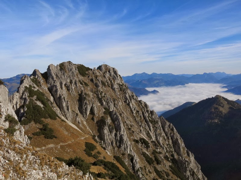 Da wir den Großteil der Höhenmeter hier schon hinter uns hatten, gönnten wir uns eine ausführliche Pause und genossen den Blick über das nebelbedeckte Inntal und auf die steilen Wände des Wilden Kaisers. Wir waren an diesem schönen Herbsttag die ersten hier heroben, von der Kufsteiner Seite kam allerdings bald auch ein Wanderer herauf, der etwas Abstand vom Gipfel und von uns haltend Ruhe und Aussicht einzusaugen schien.