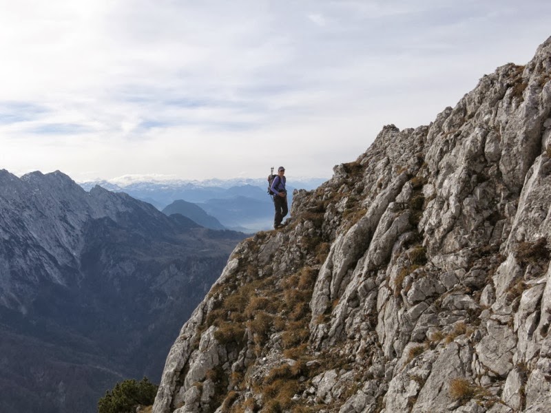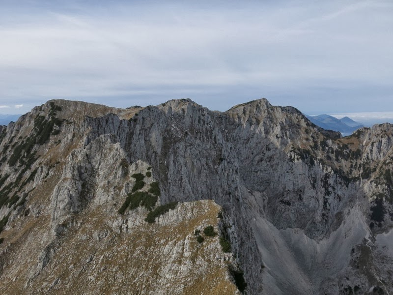 Auch bis hierher hatte der Grat schon einige anregende Stellen gehabt, was auch dem „stellenweise nicht brüchigen“ Fels geschuldet war, wie Franzi etwas überspitzt anmerkte. In Richtung Roßkaiser wird der Fels nun nicht besser, der Grat dafür schmaler. Zunächst folgt allerdings etwas ausgesetztes Gehgelände, in dem sich hin und wieder etwas Furcht einflößende Tiefblicke in die stellenweise überhängende Nordwand auftaten. Insgesamt aber war es wunderschön hier oben mit herrlicher Aussicht auf Karwendel, Rofan, Wilden Kaiser, Steinberge und Berchtesgadener.
