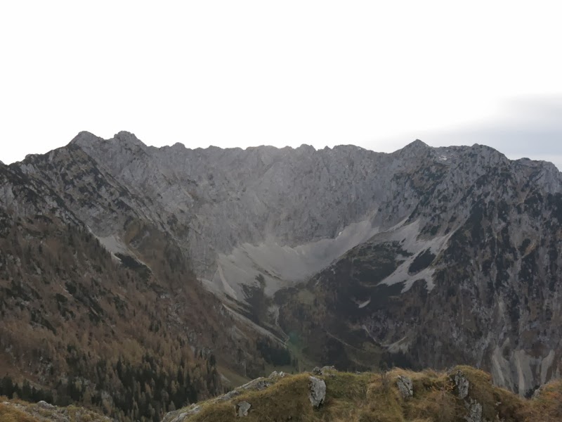 Bei ca. 1400m erreichten wir den gerölligen und felsigen Teil des Aufstieges und die angenehm wärmende Sonne erreichte uns. Über einige Versicherungen, zwischen herbstbraunem Gras und Schneeflecken ging es recht zügig voran, bis wir kurz nach zehn unseren ersten Gipfel erreichten, die Pyramidenspitze (1997m).