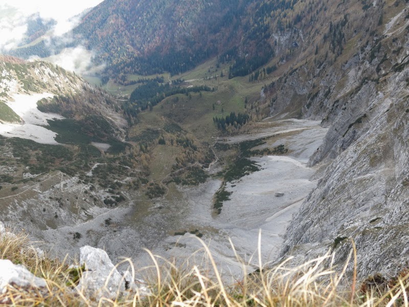 Kurz nach halb acht starteten Franzi, Mark und ich am nebelverhangenen Parkplatz in Durchholzen auf 700m. Von hier führt zunächt eine Forsstraße zur Großpoitner Alm, ab dort geht es auf einem Wanderweg durch Wald und über Wiesen tiefer ins Winkelkar hinein. Ungefähr auf dieser Höhe verließen wir auch den Nebel, der unten im Tal allerdings noch einige Stunden verharren sollte und für das herbsttypische, immer wieder großartige wandern über dem Nebelmeer sorgte.
