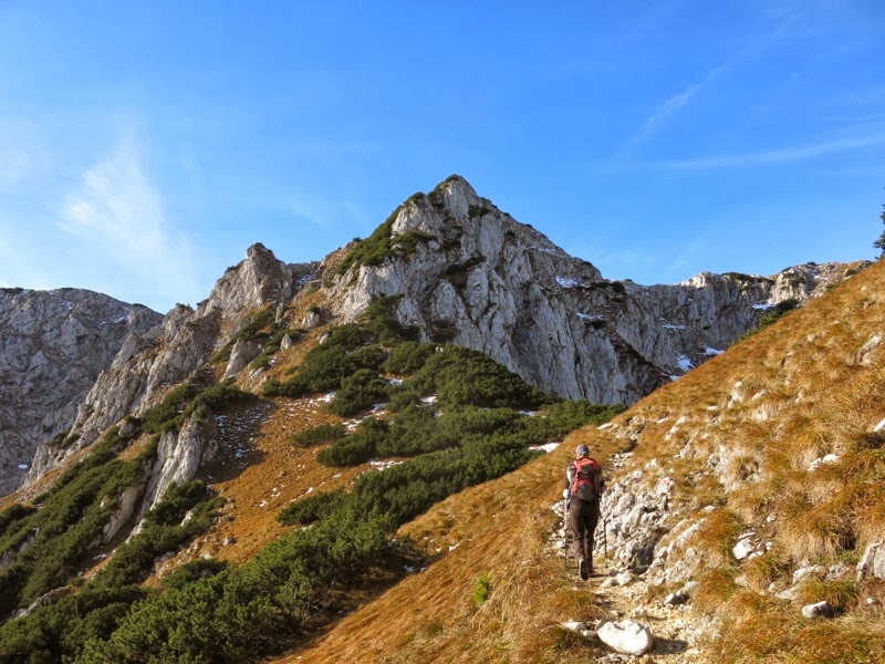 Einige Male schon hatte ich von Durchholzen aus auf die steilen Wände geblickt, die das Winkelkar umrahmen. Dort oben den Grat zu begehen, das wäre was! Zu Allerheiligen bot sich nun endlich eine gute Gelegenheit, den Hauptabschnitt dieser Überschreitung zwischen Pyramidenspitze und Roßkaiser anzugehen.